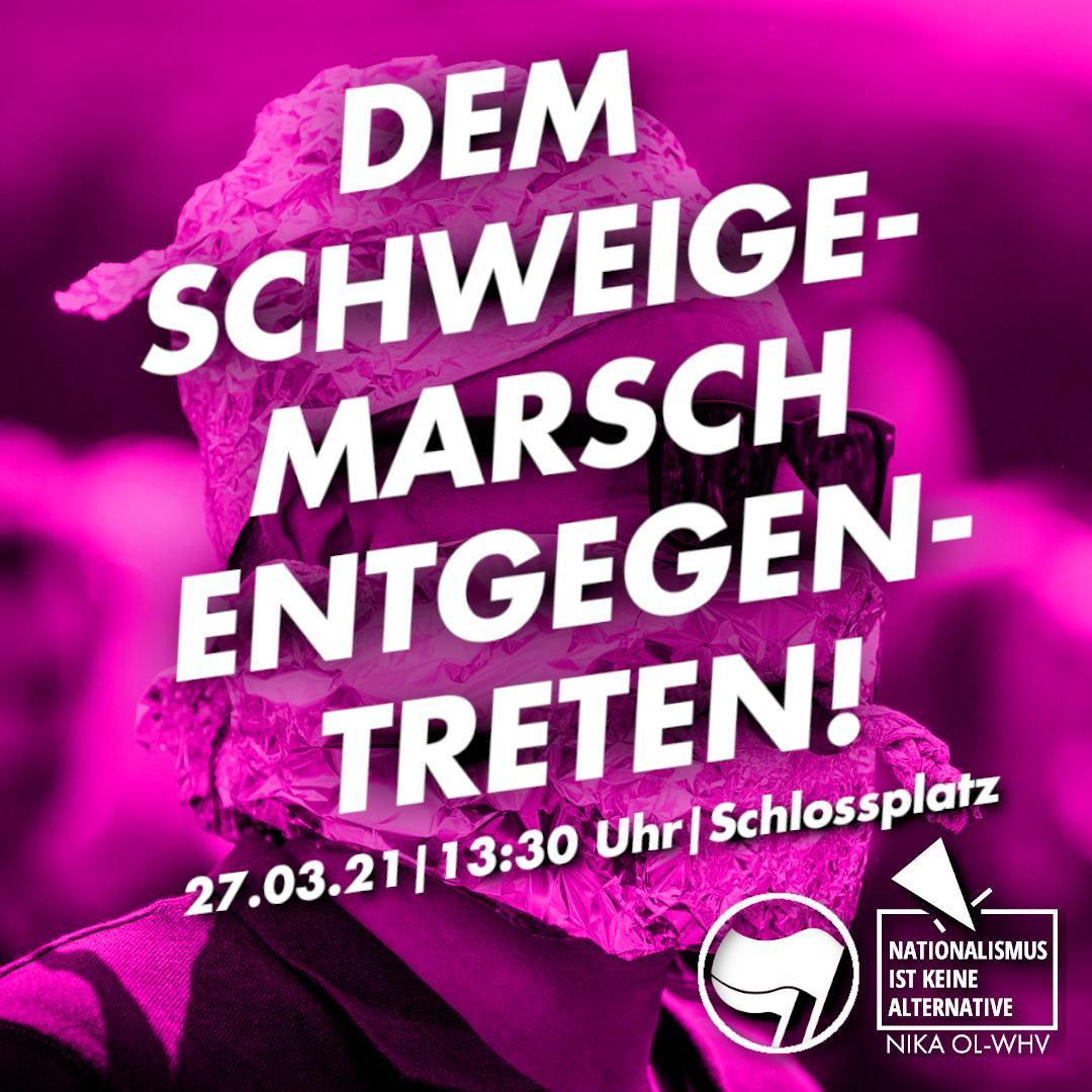Am Samstag, den 27.03.21, möchten die Oldenburger Antisemit*innen von „Querdenken“ und co. um 14:00 Uhr erneut einen Schweigemarsch vom Schlossplatz aus veranstalten. Wir werden ihnen keine ruhige Minute geben!