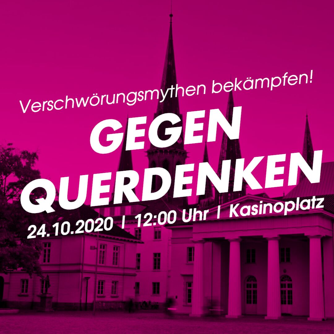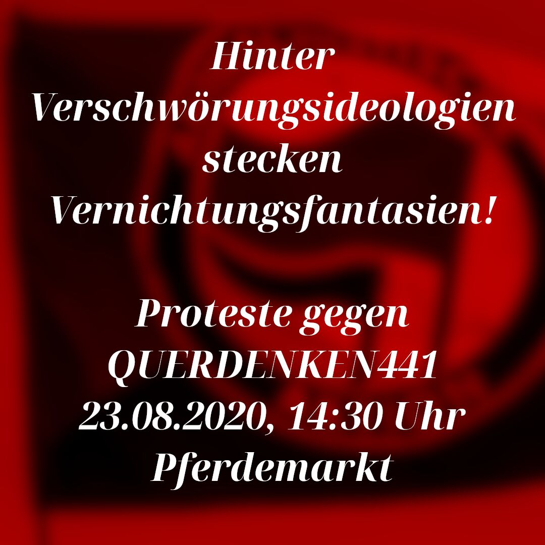 Am 23.08.2020 um 15 Uhr, will sich die verschwörungsideologische Gruppierung „Querdenken441“ erneut auf dem Pferdemarkt treffen. Eingeladen sind dieses Mal „special guests & Superman“. Auch dieses Mal rufen wir dazu auf, die Veranstaltung zu stören und den gefährlichen Verschwörungsmythen keine Plattform zu bieten. Dafür treffen wir uns um 14:30 Uhr am Pferdemarkt.