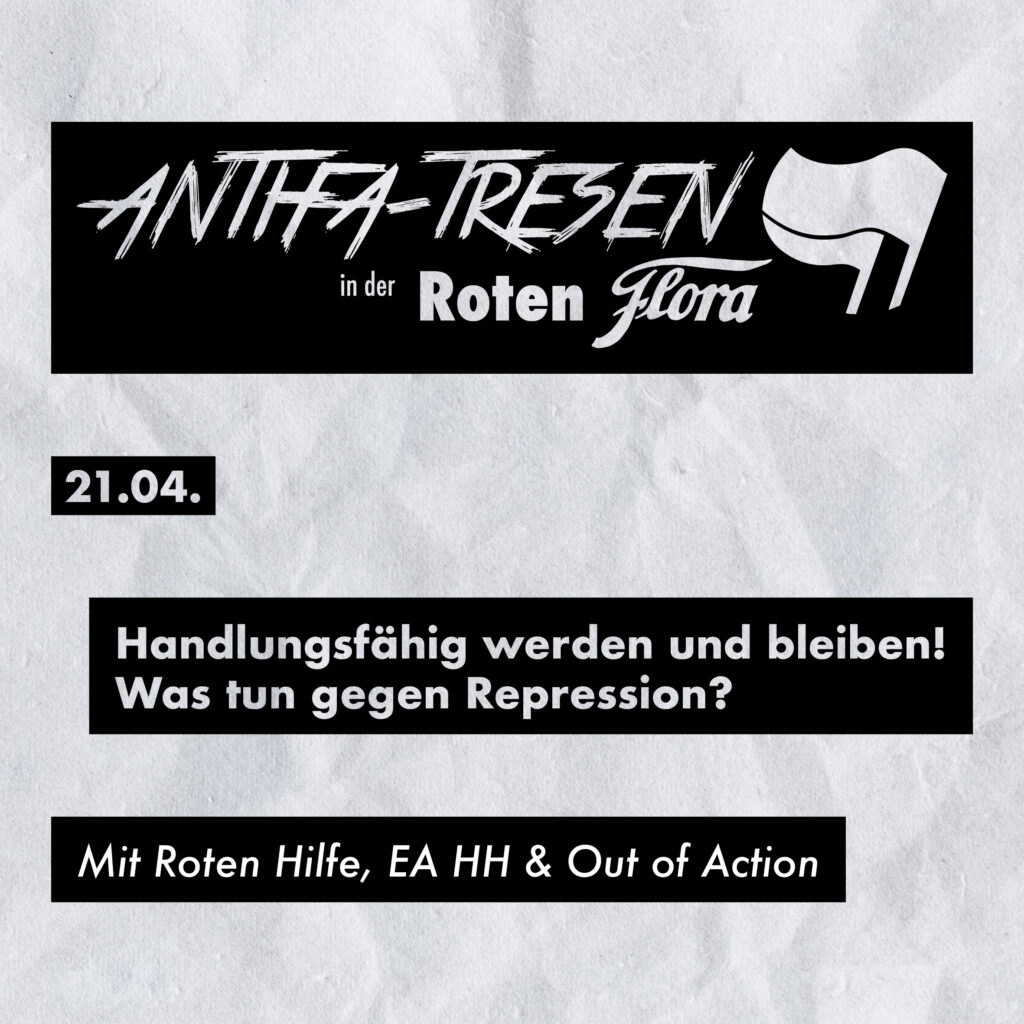 Auf was muss mensch auf Demos achten? Wie verhalten wir uns am besten, wenn Repression droht oder stattfindet? Was tun, wenn die Gewalt der Bullen uns psychisch belastet? Mit Referen:innen der Roten Hilfe, dem EA HH und Out of Action. Zur gemeinsamen Vorbereitung auf den Kampftag der Arbeiter:innenbewegung.