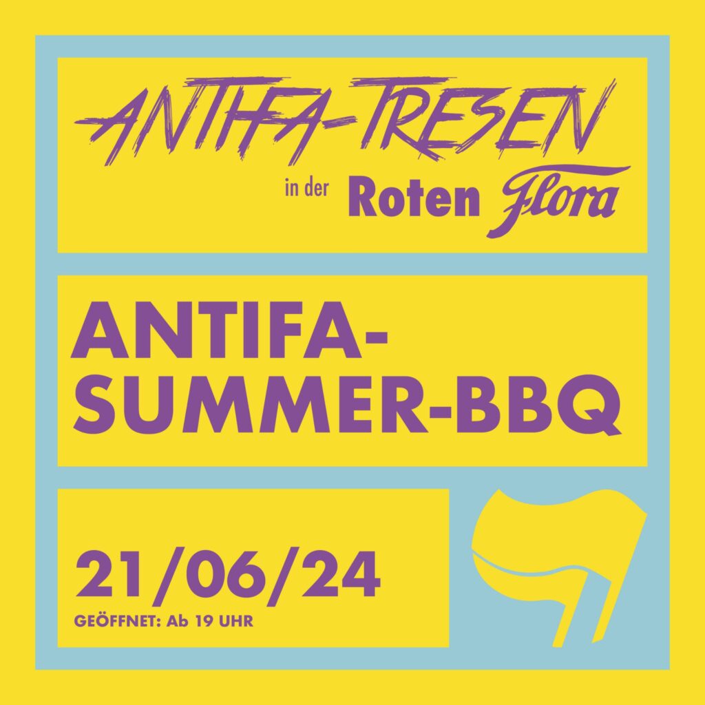 3rd time of BBQ! Im Juni werden wir wieder den Grill anschmeißen und laden zum BBQ im Garten der Roten Flora ein. Es wird kühle Getränke, frische Soli-Drinks und vegane Leckereien geben.