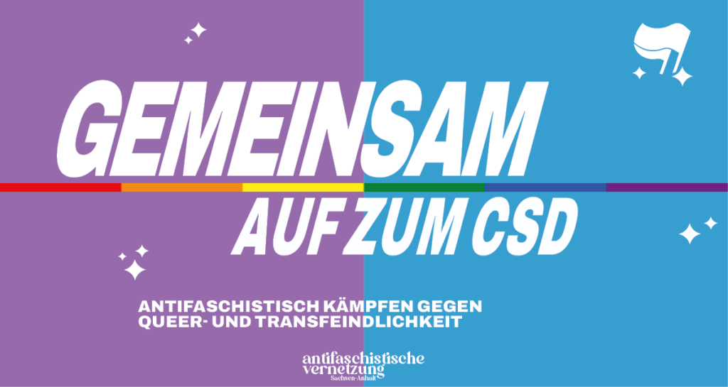 Als Antifaschistische Vernetzung Sachsen-Anhalt rufen wir dazu auf, gemeinsam zu den CSD´s zu fahren und uns dort dem Faschismus und seinen queerfeindlichen Ideologien entgegen zu stellen.