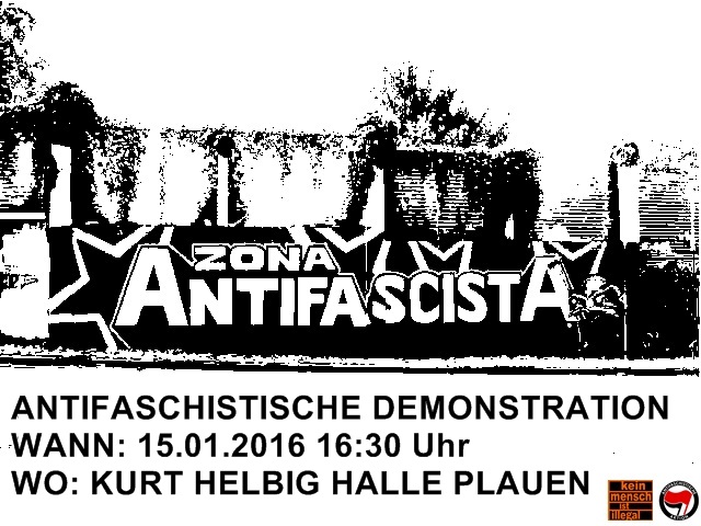 2016 werden auch wir weiterhin auf die Straße gehen, um rassistischer und nationalistischer Hetzpropaganda entgegen zu treten. Ein ständiges dagegen sein, das im bloßen Reagieren auf Naziaktivitäten besteht, reicht uns aber nicht – deshalb werden wir am 15.01. eine antifaschistische Demonstration durch die Straßen von Plauen durchführen, um eigene Inhalte zu vertreten. Wir werden uns mit den konkreten Fluchtursachen auseinandersetzen und zudem die Anwohner*Innen darüber informieren, um wen es sich beim III. Weg tatsächlich hinter der akkuraten Fassade handelt.