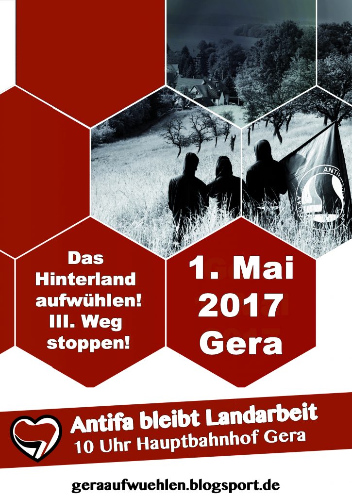Wir wissen, dass die politischen Strukturen in den Provinzen, den Kleinstädten und ländlichen Regionen andere sind als in den Großstädten. Doch auch hier widersetzen sich Menschen aktiv menschenfeindlichen Einstellungen. Zeigt Solidarität mit denen, die dafür Tag für Tag ein teilweise existenzielles Risiko eingehen. Supportet die, die den manchmal aussichtslos scheinenden Widerstand gegen deutsche Zustände und Nazis wie die des III. Wegs auch abseits der Szenekieze leisten.Daher rufen wir zu unserer Demo am 1. Mai um 10 Uhr am Hauptbahnhof Gera auf. Lasst uns Inhalte zur Diskussion stellen, entschlossen und direkt sein. Lasst uns den Nazis den Raum nehmen, den sie für sich und ihre menschenverachtenden Einstellungen und Handlungen beanspruchen wollen.