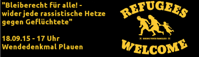 Am Freitag, dem 18.09.2015, hat die neue rassistische Gruppierung „Plauen wehrt sich“ ab 18:30 eine Kundgebung auf dem Postplatz (Tunnel) in Plauen angemeldet. Unter dem Titel „Plauen wehrt sich – Schluß mit Asylmißbrauch und Überfremdung“ soll wieder einmal gegen Geflüchtete gehetzt werden. Als Redner werden David Köckert (NPD-Stadtrat Greiz), Arne Schimmer (NPD-Kreisrat Vogtland) und Jens Baur (NPD-Stadtrat Dresden) auf ihrer Facebook-Seite angekündigt. Damit haben sie sich nun frühzeitig als NPD geoutet, auch wenn sie das gerne anders behaupten. Wir, das „Aktionsbündnis Vogtland gegen Rechts“ , werden das nicht unkommentiert geschehen lassen und rufen deshalb zu einer Gegenkundgebung am 18.09.2015 ab 17:00 auf – am Wendedenkmal in Plauen.