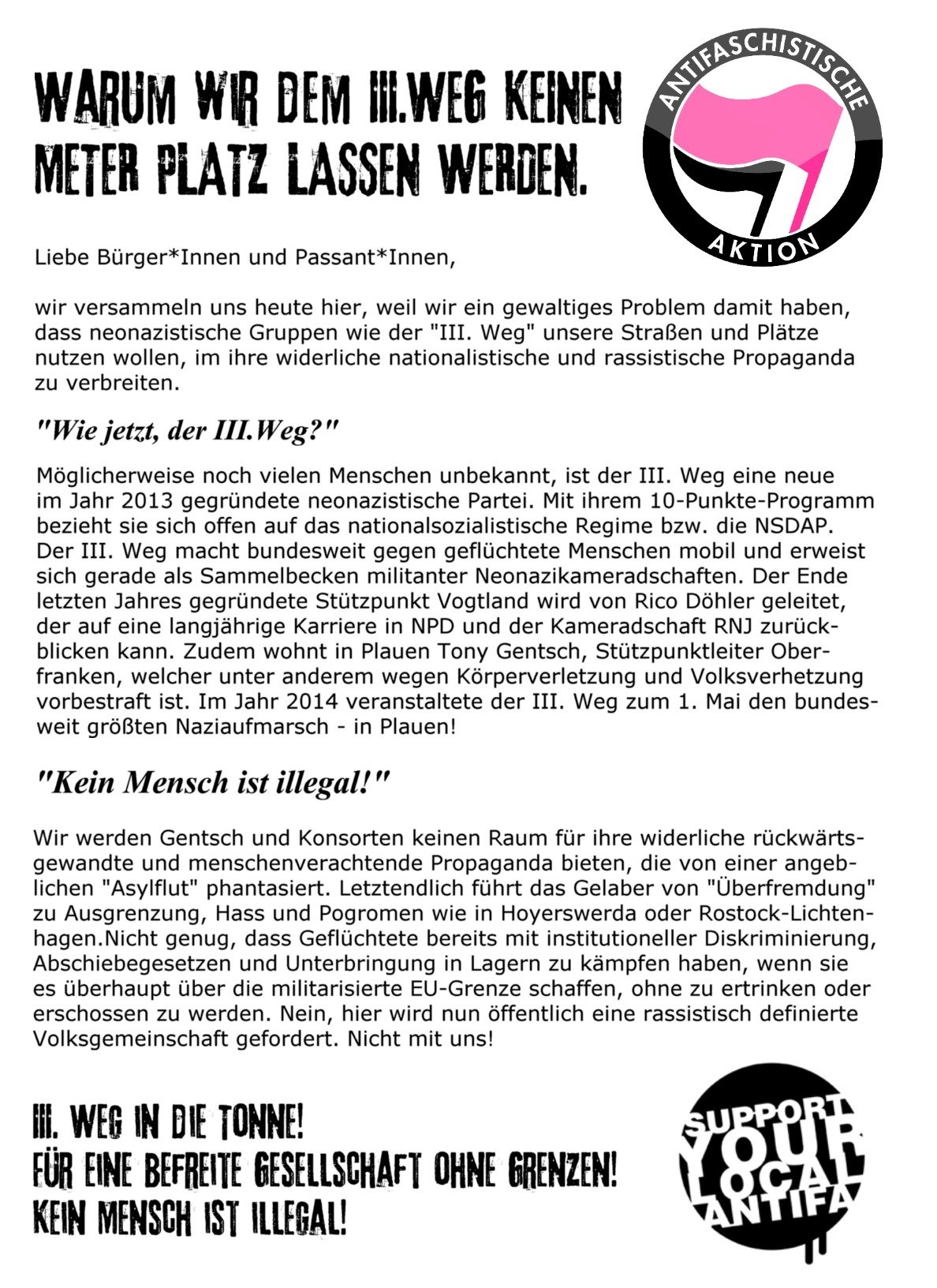 Rico Döhler, Anmelder der Nazikundgebung, staunte nicht schlecht als er sich gegen 17 Uhr zum Plauener Postplatz bewegte – denn dort warteten schon etwa 70 Antifaschist*Innen auf ihn. Kurzfristig mobilisiert, fand sich eine große Zahl solidarischer Menschen zusammen, die den Kundgebungsort kurzerhand besetzten. Auch eine Räumungsandrohung der Bullen konnte die Aktivist*Innen nicht dazu bewegen, den Platz zu verlassen. Und so mussten Döhler, Gentsch und Konsorten kurzerhand auf einen unattraktiveren Platz am Rande ausweichen. Dort wurden sie von Sprechchören und mitgebrachten Krachwerkzeugen der Antifaschist*Innen permanent übertönt. Zugleich verteilten Aktivist*Innen Flyer an die anwesenden Passant*Innen, um über den III. Weg und dessen rassistische Parolen zu informieren.