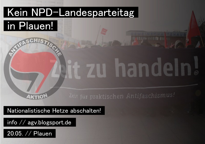 Wir werden es nicht widerspruchslos hinnehmen, dass der NPD Raum für rassistische und nationalistische Propaganda gelassen wird. Deshalb rufen wir alle AntifaschistInnen dazu auf, am 20. Mai in Plauen den Parteitag in der Festhalle dezentral zu stören und diesen gezielt zu verhindern.