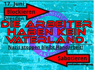 Es ist wichtig, die Nazis aufzuhalten. In der brauen Hochburg Sachsen ist Dresden nur eine Stadt wie viele andere. Nachdem der Großaufmarsch von Dresden drei mal in Folge verhindert wurde, suchen die Nazis andere sichere Aufmarschplätze. Gedenkmärsche schießen in der BRD wie Pilze aus dem Boden, Plauen und Chemnitz sind nur zwei Beispiele aus Sachsen. Dass sie Dresden nicht verloren geben wollen, zeigt unter anderem der 17. Juni. Bei den meisten Nazidemos versuchen sie dabei, an bestehende Gedenkrituale anzuknüpfen. Wie bis vor einigen Jahren zum 13. Februar, hat die Stadt hier wieder kein Problem, mit Nazis zusammen eine Gedenkveranstaltung abzuhalten. Ähnlich wie am 13. Februar versuchen die Nazis, dort ihre Wahrheit zu präsentieren, so wurde in den letzten drei Jahren ein Arbeiter_innenaufstand ganz schnell zum Volksaufstand und versucht somit die eigene Vergangenheit zu vertuschen. Die Gleichschaltung der Gewerkschaften im NS ist da schnell vergessen. Es sei hier darauf hingewiesen, dass es in der DDR faktisch auch kein Streikrecht gab und die Arbeiter_innen allen Grund zur Revolte hatten. Trotzdem hinkt der Vergleich von DDR und NS-Staat, wie ihn die Extremismus-Doktrin gern herbei zieht. Aber dass mensch in Sachsen kein Problem hat, die Befreier_innen von Auschwitz mit den Erbauer_innen gleich zu setzen ist Realität und zeigt sich im sächsischen Versammlungsgesetz, in dem kommunistische Verherrlichung genau so verboten ist, wie die Verherrlichung des Nationalsozialismus. Es ist an uns, das aufzuhalten, was längst schon wieder ins Rollen gekommen ist. Die Öffentlichkeit solcher Nazidemos können wir nicht tatenlos hinnehmen. Solche Demos sind immer identitätsstiftendes Moment und Möglichkeit zur Vernetzung für die Nazis. Aber damit nicht genug: es ist auch für uns die Möglichkeit zu demonstrieren, wie mit Nazis umgegangen werden sollte und dass wir unsere Vorstellung davon auch auf der Straße durchsetzen. Deshalb rufen wir zur Blockade des Aufmarsches auf! Organisiert Euch in Bezugsgruppen, um schnell und koordiniert vorgehen zu können. Also raus auf die Straße und lasst uns zeigen, was wir von Nazis und Repressionen halten!