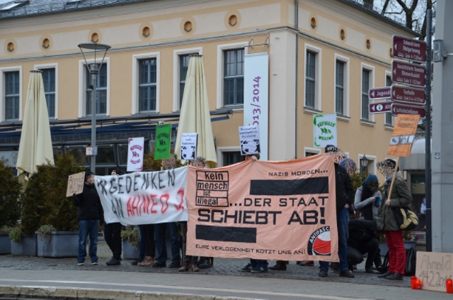 Spontan versammelten sich am Samstag Nachmittag etwa 20 Menschen vor dem Asylbewerberheim in der Kasernenstraße, um Ahmed J. zu gedenken. Im Anschluss wurde im Stadtzentrum eine Kundgebung durchgeführt. Etwa 30 Leute erinnerten mit Transparenten, Flyern und Redebeiträgen an den Tod Ahmed J.s und zugleich an die Diskriminierung von Geflüchteten innerhalb der Festung Europa.
