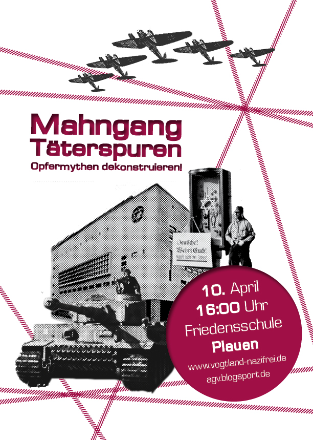 – 10.04. Um die 100 Menschen nehmen am zweiten „Mahngang Täterspuren“ teil, der sich kritisch mit der Rolle Plauens in der nationalsozialistischen Vernichtungsmaschinerie auseinandersetzt. Das Motto der Veranstaltung ist „Opfermythen dekonstruieren“.