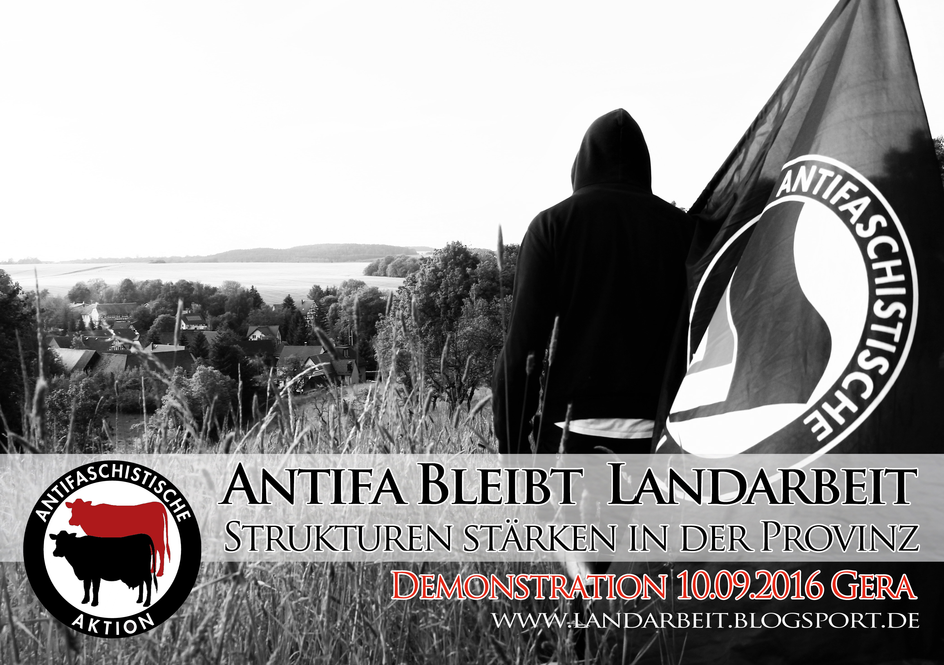 Am 10.09.2016 wird unter dem Motto „Antifa bleibt Landarbeit“ zu einer Demonstration in die ostdeutsche Provinzstadt Gera aufgerufen – ins viel beschworene Hinterland. Der Aufruf sowie die herausgegebenen Texte sind Demoaufruf, Hilfeschrei und der Versuch, eine längst überfällige Debatte anzustoßen in einem. Herausgegeben von den letzten, völlig erschöpften Antifaschist_innen der Provinz, die hier allen ernstes noch leben und seit Jahren unermüdlich gegen die Windmühlenflügel dieser schrecklichen Normalität ankämpfen.