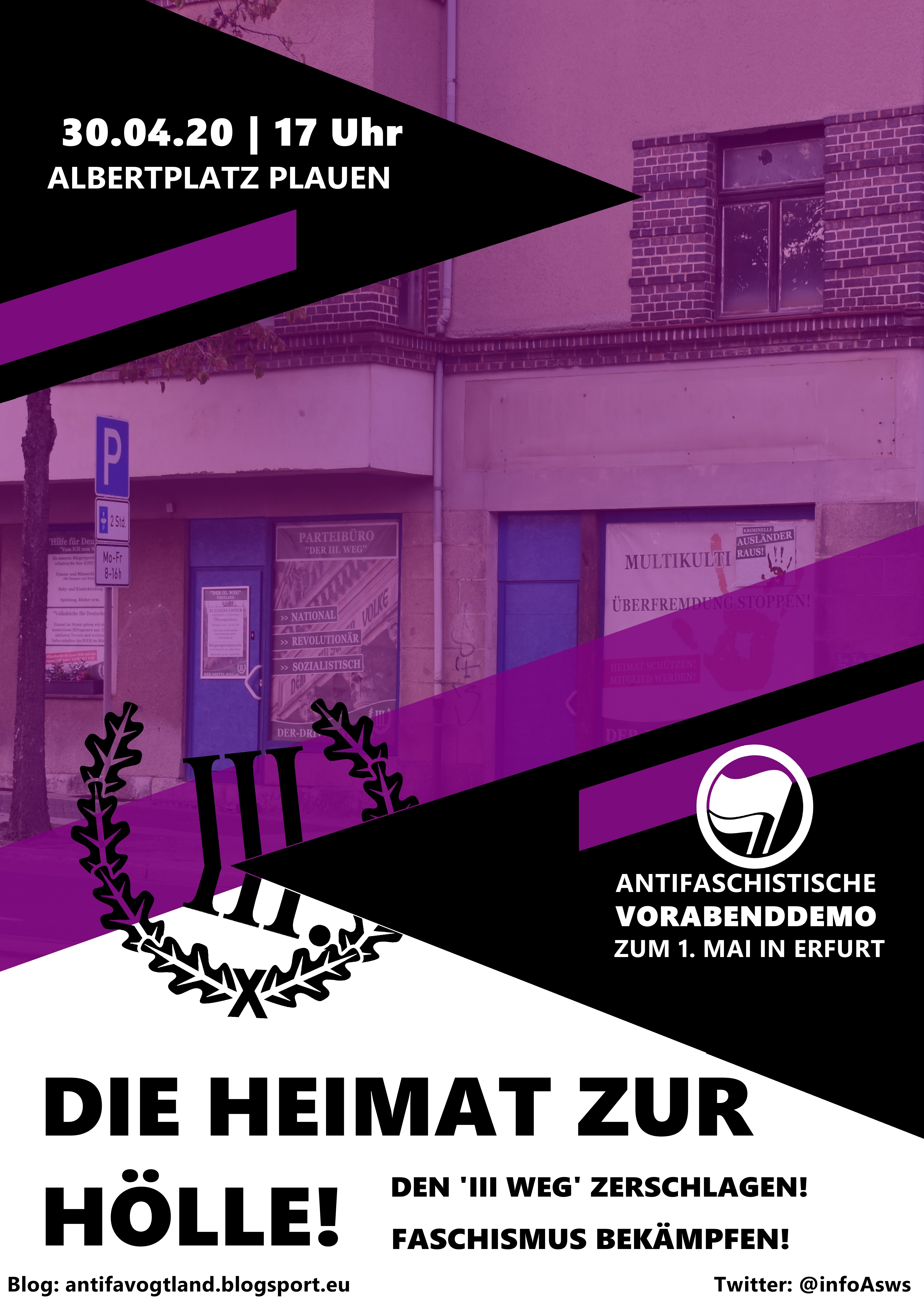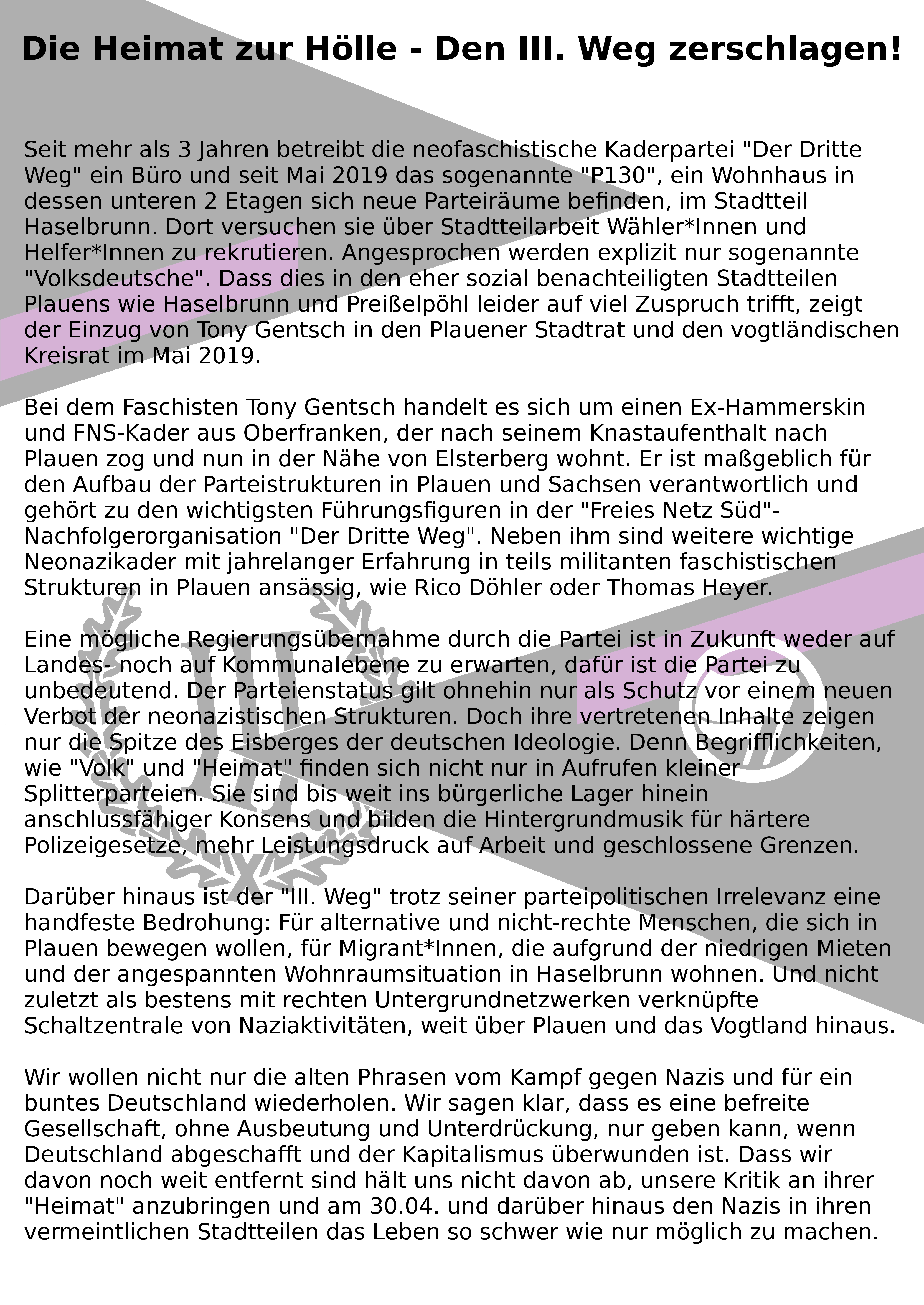 Seit mehr als 3 Jahren betreibt die neofaschistische Kaderpartei „Der Dritte Weg“ ein Büro und seit Mai 2019 das sogenannte „P130“, ein Wohnhaus in dessen unteren 2 Etagen sich neue Parteiräume befinden, im Stadtteil Haselbrunn. Dort versuchen sie über Stadtteilarbeit Wähler*Innen und Helfer*Innen zu rekrutieren. Angesprochen werden explizit nur sogenannte „Volksdeutsche“. Dass dies in den eher sozial benachteiligten Stadtteilen Plauens wie Haselbrunn und Preißelpöhl leider auf viel Zuspruch trifft, zeigt der Einzug von Tony Gentsch in den Plauener Stadtrat und den vogtländischen Kreisrat im Mai 2019.
