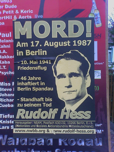Am 17. Au­gust 1987 starb Ru­dolf Hess, der Stell­ver­tre­ter Adolf Hit­lers, im Kriegs­ver­bre­cher­ge­fäng­nis Span­dau. Neo­na­zis in Deutsch­land und Eu­ro­pa mach­ten aus Hess einen Mär­ty­rer, da er nie mit dem Na­tio­nal­so­zia­lis­mus ge­bro­chen hat. Die ver­schwö­re­ri­schen Neo­na­zis glau­ben, Hess sei durch den bri­ti­schen Ge­heim­dienst er­mor­det wor­den. Jähr­lich or­ga­ni­sie­ren bun­des-​ und eu­ro­pa­weit Neo­na­zis Ak­tio­nen rund um Hess‘ To­des­tag.