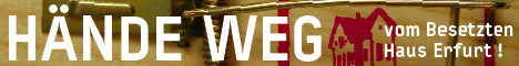 Be­setz­te Häu­ser sind bun­des­weit mitt­ler­wei­le so sel­ten ge­wor­den, dass mensch sie an einer Hand ab­zäh­len kann. Auch le­ga­le selbst­ver­wal­te­te Haus­pro­jek­te sind meist la­tent von der Schlie­ßung be­droht. Im April 2001 wurde ein Teil des ehe­ma­li­gen Topf & Söh­ne-​ Ge­län­des in Er­furt be­setzt. Seit Ok­to­ber die­sen Jah­res ist das Ge­län­de vom Ab­riss be­droht. Das Grund­stück wurde bis zum Be­ginn des Jah­res 2007 not­ver­wal­tet und dann an die Do­mi­cil Haus­bau GmbH und Co KG aus Mühl­hau­sen ver­kauft. Nach­dem der Not­ver­wal­ter die Be­set­zung ge­dul­det hatte, kün­dig­te der neue Be­sit­zer Herr Golla nach einer kur­zen Zeit der Dul­dung nun an, dass er alle Ge­bäu­de auf dem be­setz­ten Areal so schnell wie mög­lich ab­rei­ßen will. Ge­plant ist an ihrer Stel­le ein Ge­wer­be-​ und Wohn­ge­biet an­zu­sie­deln. Continue reading Hände weg vom besetzten Haus in Erfurt!