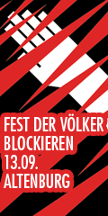 Genau jene Rück­grat­lo­sen – tau­sen­de Neo­fa­schis­t_in­nen, füh­ren­de Ver­tre­ter rechts­ex­tre­mer Or­ga­ni­sa­tio­nen sowie Rechts­rock­bands, die aus dem Blood-​and-​Ho­nour Netz­werk stam­men – wol­len sich er­neut zum „Fest der Völ­ker“ ver­sam­meln. Be­reits zum vier­ten Mal mel­det die NPD das eu­ro­pa­wei­te Groß­er­eig­nis an. An­ders als in den Jah­ren zuvor ver­su­chen die Nazis nicht mehr in Jena mit die­ser Ver­an­stal­tung Fuß zu fas­sen; sie wei­chen aus in die Pro­vinz: In Al­ten­burg rech­nen sie nicht mit ent­schlos­se­ner Ge­gen­wehr. Die Wahl des Ortes ist kein Zu­fall: Na­zi­ka­der und „Fest der Völ­ker“-​Mit­or­ga­ni­sa­tor Tho­mas Ger­lach stammt aus die­ser Stadt. Continue reading 13. September: Kein „Fest der Völker“ – nirgends!