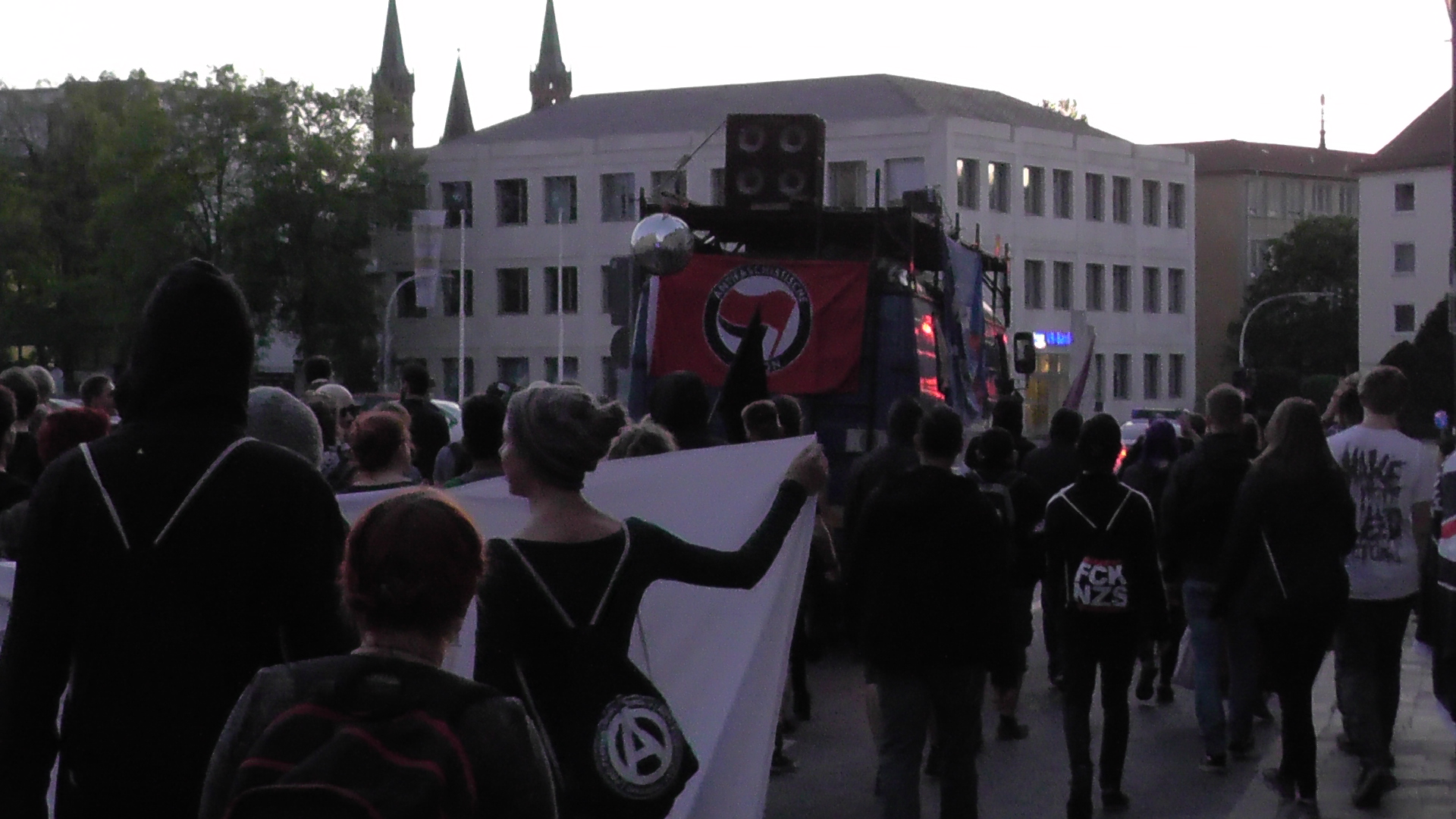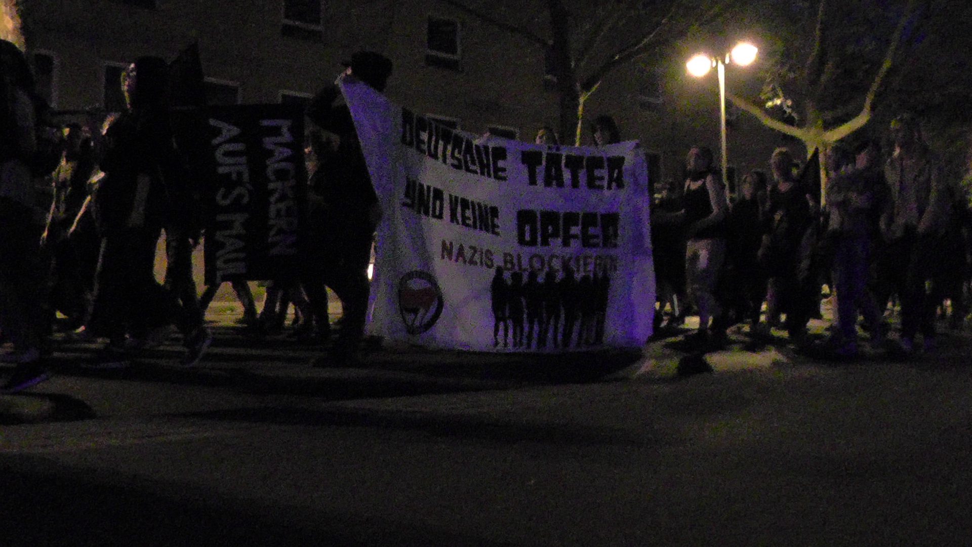 Das Ende des Aktionswochenendes markierte eine etwa 40 Personen umfassende Demo am Sonntagnachmittag, dem Tag der endgültigen deutschen Kapitulation. Mit Parolen wie „Mord, Folter, Deportation- das ist deutsche Tradition“ oder „Nie wieder Deutschland!“ zogen die Demonstrierenden nochmals zum Residenzplatz und hielten schließlich am Barbarossaplatz eine kleine Kundgebung ab. Da die Mobilisierung für diese Demo eindeutig im Schatten der Nachttanzdemo stand, fiel sie recht klein aus, aber der symbolische Bezug zu diesem speziellen Tag war uns dennoch wichtig.