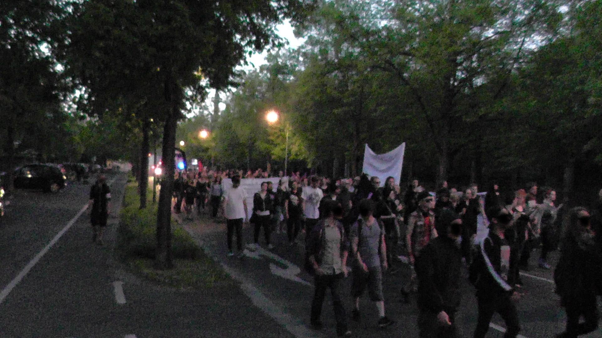 Am nächsten Tag fand die Nachttanzdemonstration statt. Im Vorfeld hatte die Stadt den Veranstalter*innen Steine in den Weg gelegt, indem sie versuchte, den Lautsprecherwagen zu verbieten. Außerdem durften nur zwei Seitentransparente mit maximal 1, 50 Meter mitgeführt werden. Insgesamt wurden die Auflagen mit überzogener, penibler, typisch deutscher Genauigkeit kontrolliert. So wurden sogar Außenstehende von der Polizei dazu genötigt, ihre Getränke zu entfernen. Unserem Aufruf folgten zu der Auftaktkundgebung am Bahnhofsvorplatz geschätzte 120 Personen. Anfangs wurde eine feministische Rede verlesen, die zu einem queerfeministischen ersten Block aufrief, gefolgt vom Mobitext (Aufruf).