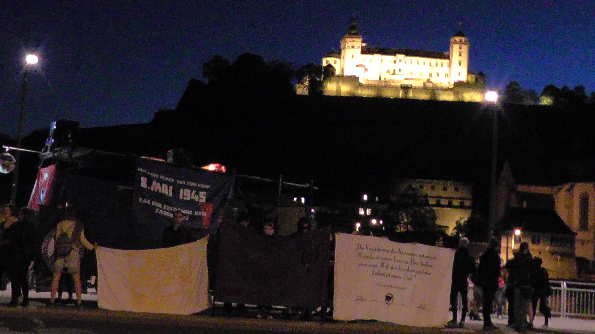 Der zwischenzeitlich bis auf etwa 250 Personen angewachsene Demozug wurde am Mainkai bei der Abschlusskundgebung mit einem Feuerwerk von der Festung begrüßt. Dort wurde in Reden unter Anderem zum Protest gegen den Coburger Convent (Aktionswochenende in Coburg) aufgerufen, sowie unsere Abschlussrede (link folgt) verlesen.