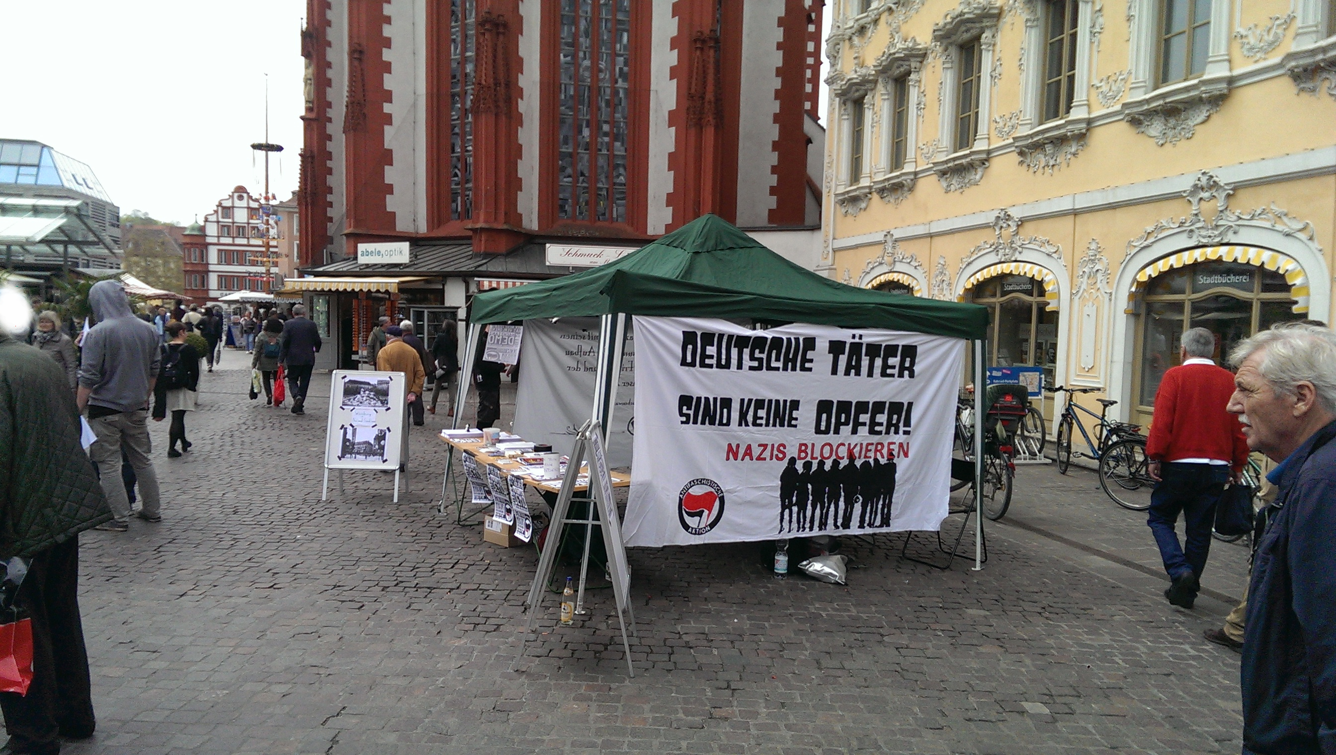 Am Freitagnachmittag versammelten sich ca. 20 Antifaschist*innen zu einer etwa vierstündigen Kundgebung am Oberen Markt in Würzburg vor dem Falkenhaus. Es wurden Reden gehalten, die sich mit der Gedenkkultur der Würzburger*innen auseinandersetzen. Beispielsweise wurde in einer Rede thematisiert, dass in Würzburg ein martialisches Denkmal für die deutschen Soldat*innen der beiden Weltkriege steht und in unmittelbarer Umgebung den Opfern der Shoa ein wesentlich kleineres Denkmal gewidmet ist. Dies ist nur eines von vielen Beispielen, die zeigen, wie Täter aus der Nazizeit als Helden oder wie im Falle der Zerstörung Würzburg als Opfer des Krieges verklärt werden.