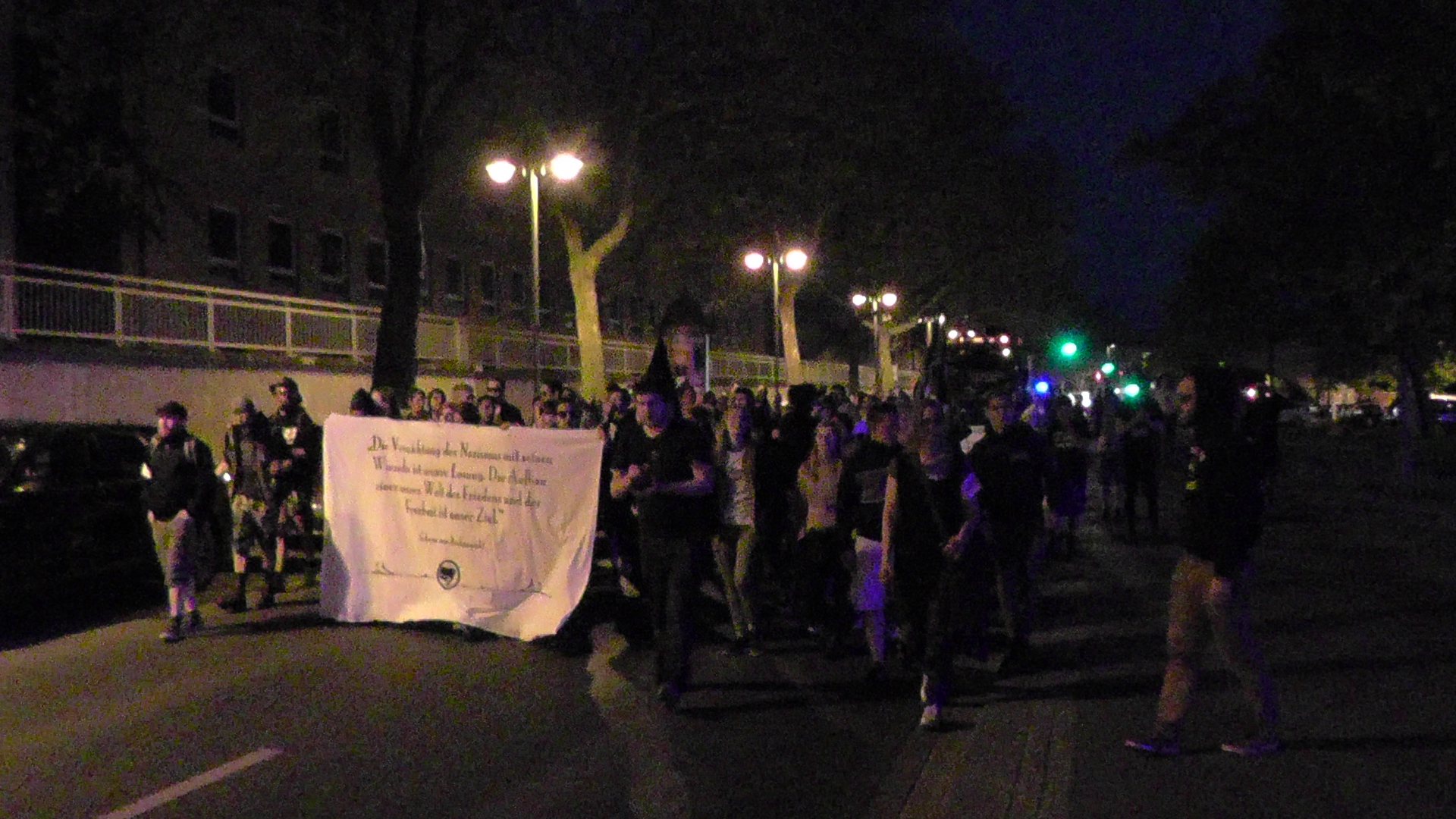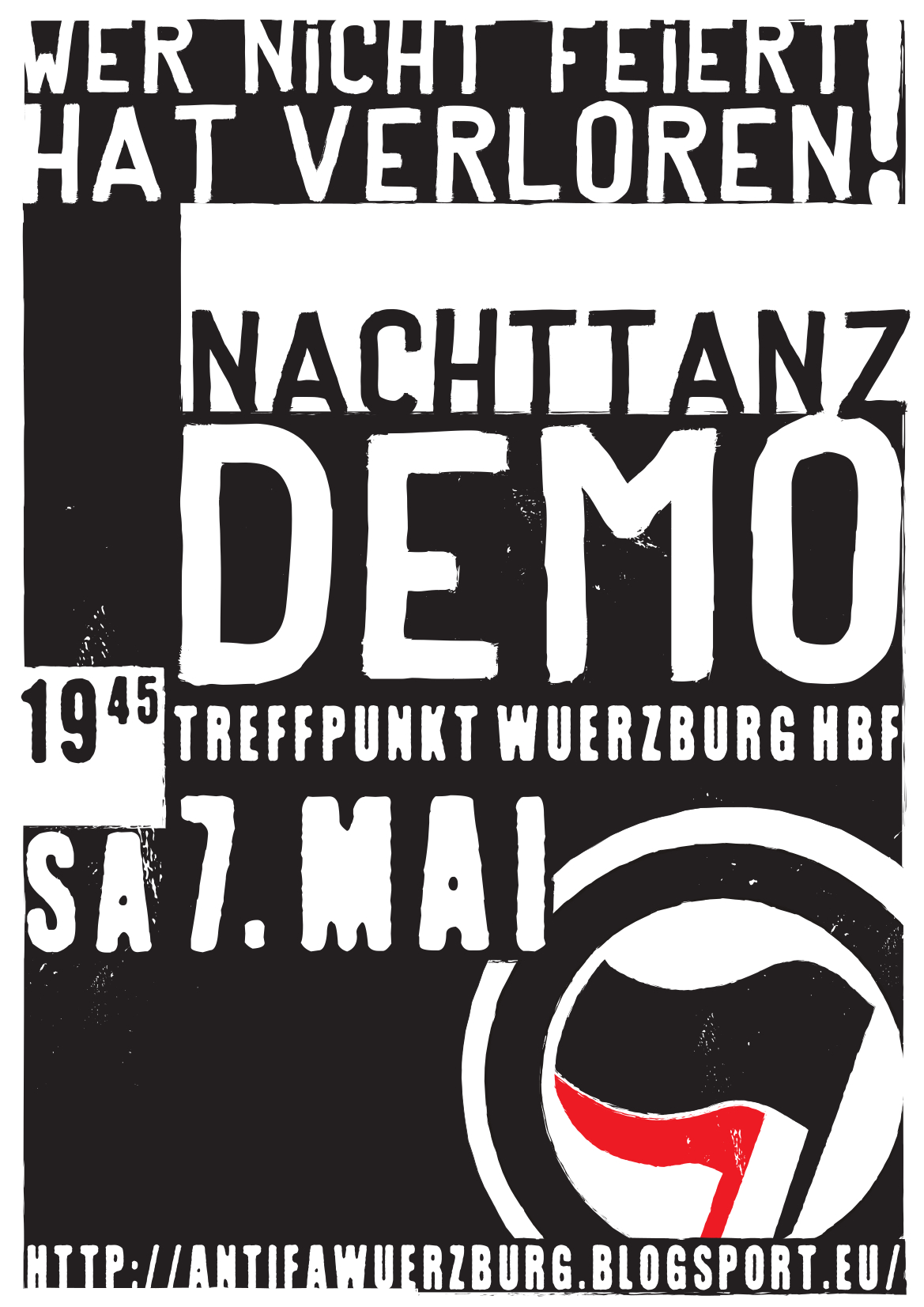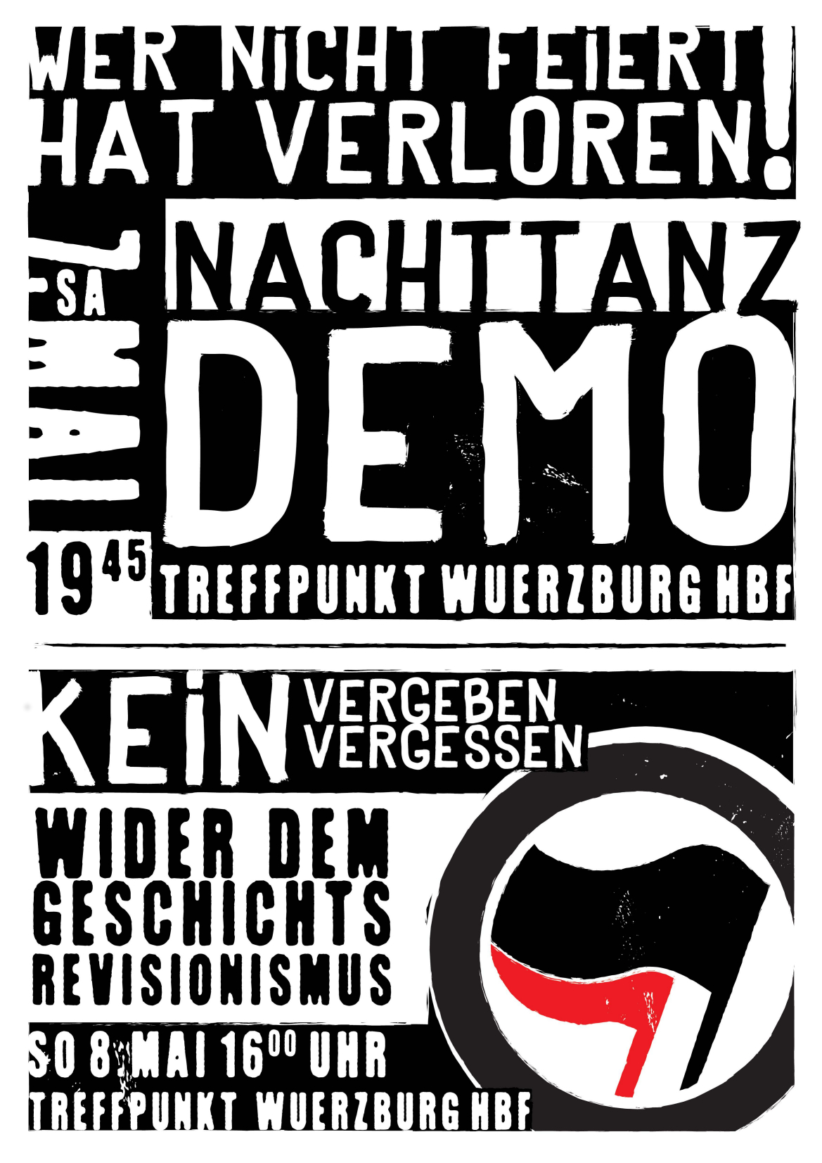 Wir hingegen werden es nicht zulassen, dass Würzburg oder Deutschland die Schuld für die Verbrechen der Nazizeit abgesprochen wird. In der Region und der Stadt werden im April regelmäßig antifaschistische Aktionen stattfinden, die daran erinnern welche Grausamkeiten von diesem Flecken Erde ausgingen. Am Wochenende des 8. Mai werden wir dann ein antifaschistisches Aktionswochenende in Würzburg veranstalten. Es wird Vorträge geben, samstags eine Nachttanzdemonstration und am Sonntag, den 8. Mai, Aktionen in der Stadt.