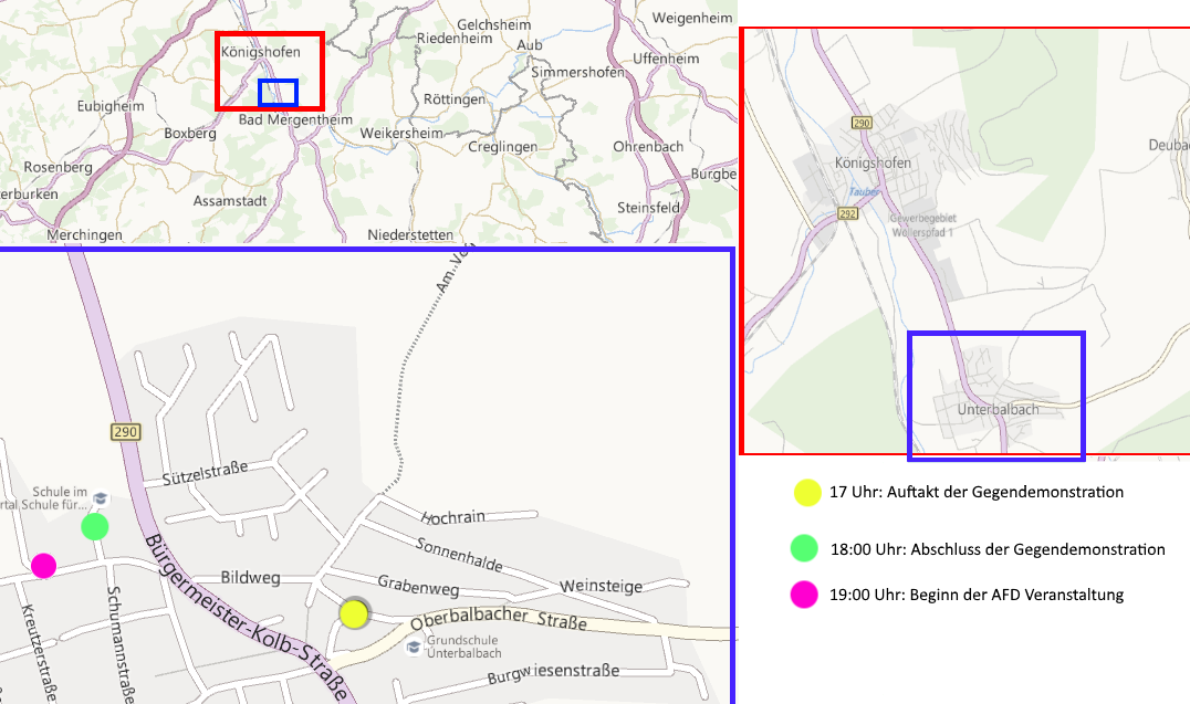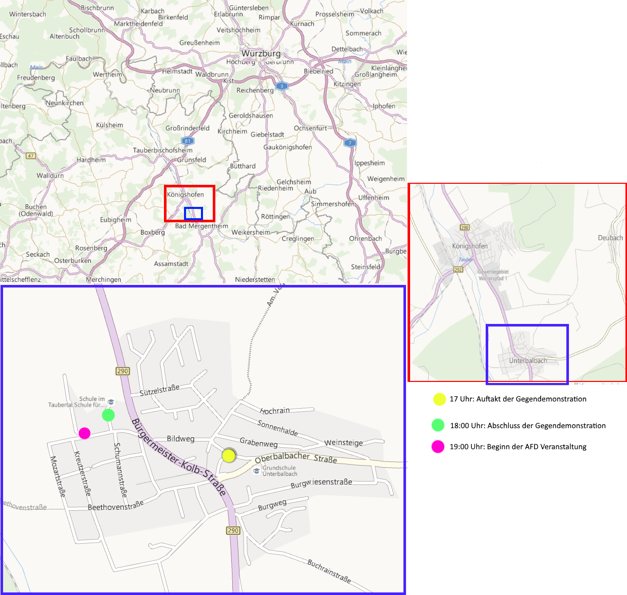Am 19. Februar um 19 Uhr wird Björn Höcke (Fraktionsvorsitzender AFD-Tühringen) in Lauda-Königshofen, OT Unterbalbach auf einer AFD Veranstaltung sprechen. Der ursprünglich für Distelhausen geplante Vortrag wurde von der dortigen Location kurzfristig abgesagt. Mergentheim gegen Rechts hat ab 18 Uhr eine Demonstration angemeldet. -> Karte