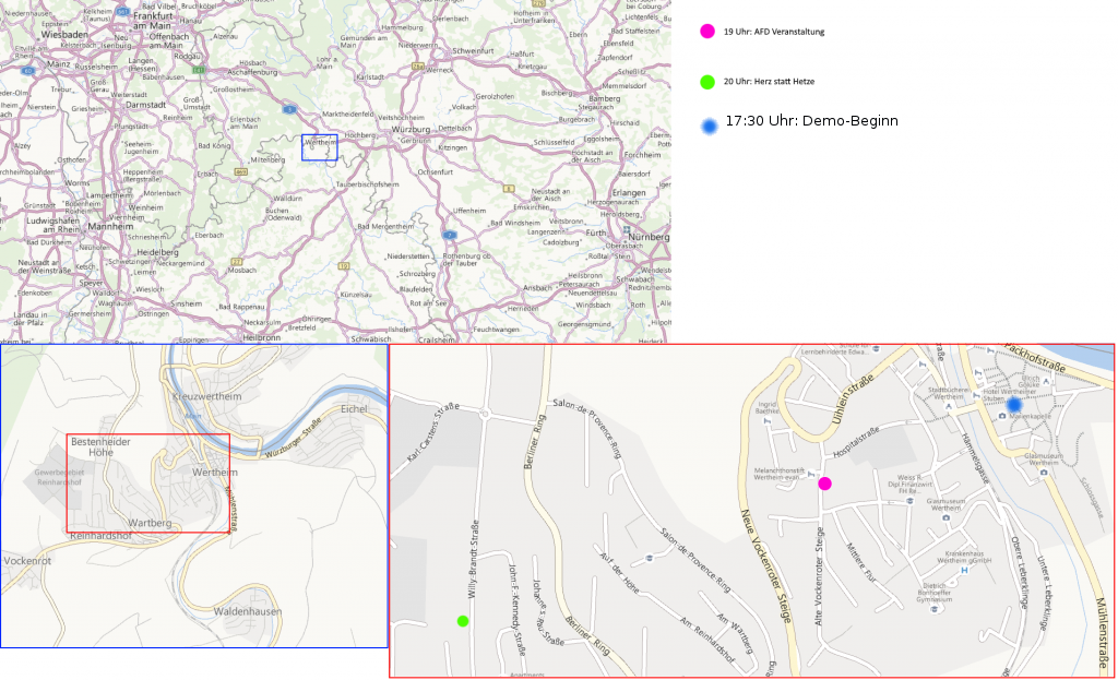 am Freitag den 04.03. findet, wie über den Verteiler mehrfach angekündigt, eine AFD Veranstaltung in Wertheim statt. Das Bündnis „Mergentheim gegen Rechts“ ruft zu einer Gegendemonstration um 17:30 Uhr am Marktplatz/Bahnhof in Wertheim & zu einem anschließenden Konzert (Herz statt Hetze) auf.
