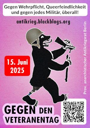 Wir bereiten uns darauf vor, am 15. Juni unsere Position für eine möglichst breite Öffentlichkeit sichtbar zu machen. Der Veteranentag ist hervorragend dazu geeignet zur Desertion und Verweigerung von Befehlen aufzurufen, sowie die Wehrpflicht anzugreifen, damit keine neuen Veteranen heranwachsen können. Denn es gibt keinen Krieg und kein Militär, wenn niemand mehr hingeht und die Befehlsketten zerstört werden, durch diejenigen, die sie einhalten sollen.