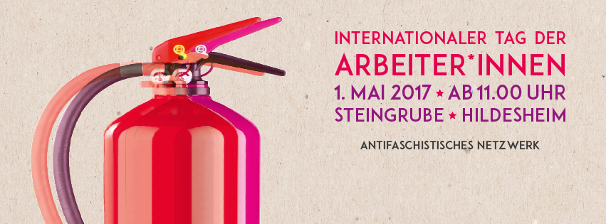 Am 01.05.2017 veranstaltet das Antifaschistisches Netzwerk Hildesheim ein Fest zum „Internationalistischen Tag der Arbeiter*innen“ von 11 bis 16 Uhr in der Steingrube in Hildesheim. Wir rufen zusätzlich alle Menschen auf, davor die DGB Demonstration um 10:45 Uhr am Hauptbahnhof zu begleiten und den internationalistischen Block zu unterstützen.