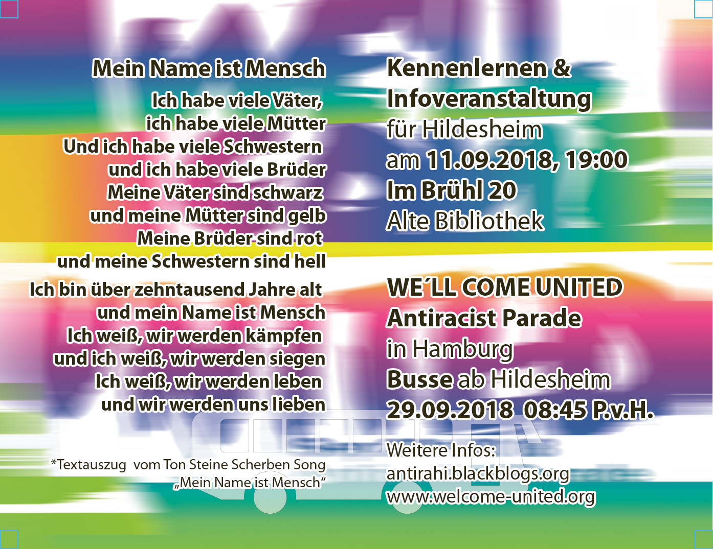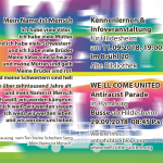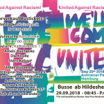 Am 29. September 2018 zieht es Menschen von überall unter dem Motto „We‘ll Come United“ nach Hamburg. Dort wird es eine große antirassistische Parade geben, um Rassismus und Herzlosigkeit von den Straßen zu verjagen und ein Bild der Solidarität, Freundschaft und Angstfreiheit zu zeichnen! Das wird unser Tag. Wir sind viele, wir sind verschieden und wir kämpfen jeden Tag vor unserer Haustür. Im September kommen wir alle zusammen, um zu feiern und zu demonstrieren: