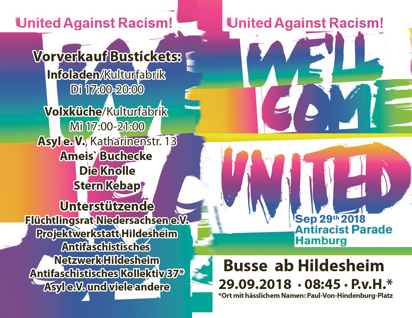 Kommt zur Info- und Bastelveranstaltung, um zu erfahren was bisher in Hildesheim zu „We’ll Come United“ geplant ist und wie wir gemeinsam am 29.09. nach Hamburg reisen können.