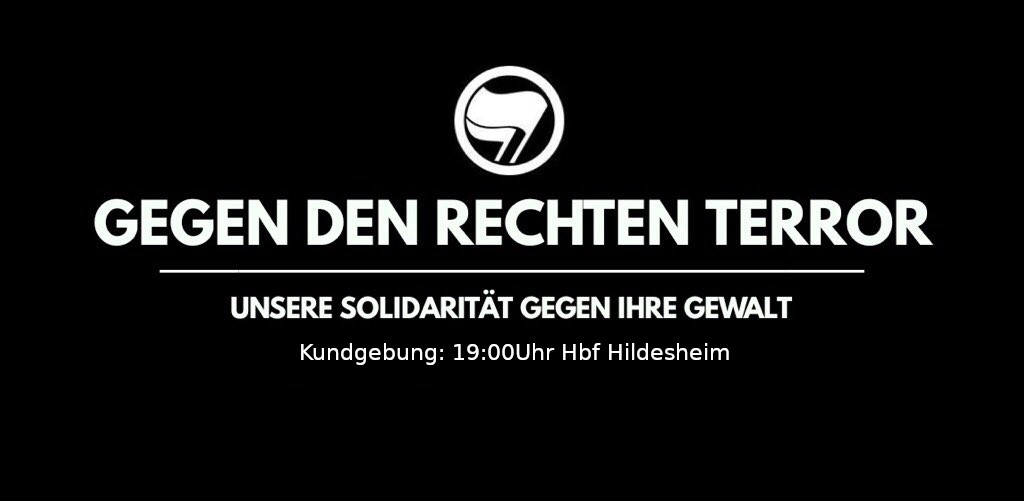 Demo – Gegen den rechten Terror – 20.02.20 19 Uhr Hbf Hi Posted on 20. Februar 2020 by admin +++ Heute 19 Uhr Hbf Hi Mahnwache +++ In Hanau hat ein Rechter ein tötliches Attentat verübt. Die Angehörigen rufen zu deutschlandweiten Mahnwachen auf. Kommt zu der in Hildesheim.