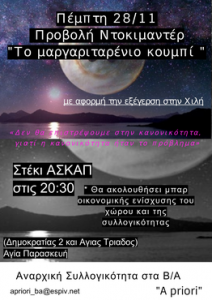 Με αφορμή τα εξεγερτικά γεγονότα στη Χιλή και στα πλαίσια των εκδηλώσεων που πραγματοποιούμε κάθε τελευταία Πέμπτη του μήνα για την οικονομική ενίσχυση του αυτοδιαχειριζόμενου κοινωνικού χώρου της Ανοιχτής Συνέλευσης Κατοίκων Αγ. Παρασκευής που μας φιλοξενεί, τη Πέμπτη 28/11/2019 και ώρα 20:30 θα προβάλουμε το ντοκιμαντέρ “Το μαργαριτένιο κουμπί”.