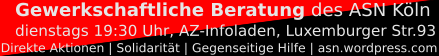 dienstags 19:30 Uhr, Infoladen im AZ Köln, Luxemburger Str. 93, U18: Eifelwall/Stadtarchiv, Weitere Termine nach Vereinbarung. Kontakt: asn-koeln [at] riseup.net