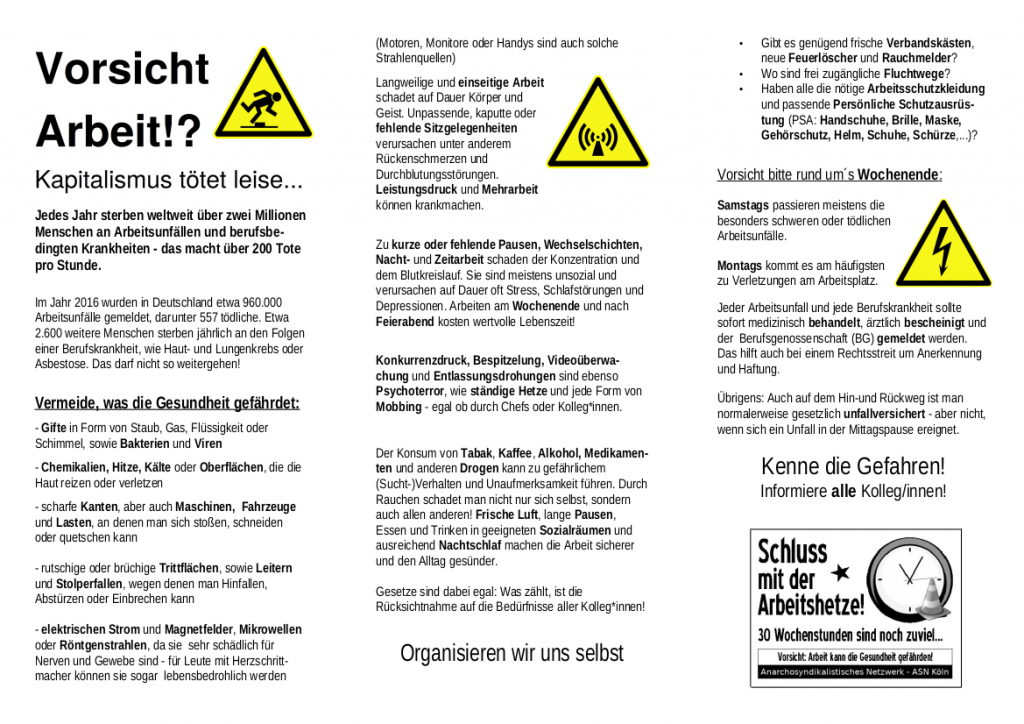 Am 28.April wird jedes Jahr den an Betriebsunfällen und Berufskrankheiten verstorbenen Arbeiter*innen gedacht. Der internationale „Workers‘ Memorial Day“ ist ein Anlass, um nicht nur auf die menschenverachtenden Ausbeutungsverhältnisse des globalen Kapitalismus hinzuweisen, sondern auch auf die gesundheitsschädlichen Folgen der industriellen Produktionsweise, vor allem für die Erwerbstätigen.