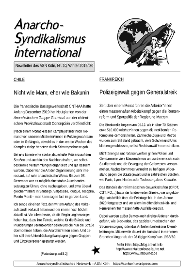 FRANKREICH: Polizeigewalt gegen Generalstreik CHILE: „Nicht wie Marx, eher wie Bakunin“ CHILE: Solidarität mit dem Protest der Arbeiter*klasse