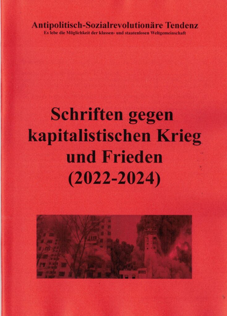 Unsere neue Broschüre „Schriften gegen kapitalistischen Krieg und Frieden (2022-2024)“ (ca. 31 Seiten) von Antipolitisch-Sozialrevolutionäre Tendenz ist da. Die Broschüre könnt Ihr hier für 3-€ (inkl. Porto) über Onlinemarktplatz für Bücher booklooker.de oder direkt bei uns auch als E-Book bestellen.