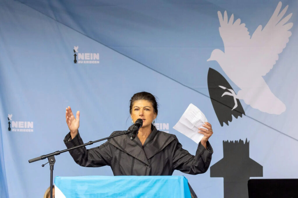 BSW Führerin Sahra Wagenknecht hält auf der Friedensdemonstration in Berlin eine Rede, 3. Oktober 2024