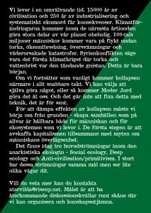 Vi lever i en omvälvande tid. 15000 år av civilisation och 250 år av industrialisering och systematiskt ekomord får konsekvenser. Klimatförändringarna kommer inom de närmsta årtionden göra stora delar av vår planet obebolig. 100-tals miljoner människor kommer vara på flykt undan torka, ökenutbredning, översvämningar och väderorsakade katastrofer. Syrienkonflikten sägs vara det första klimatkriget där torka och vattenbrist var den tändande gnistan. Detta är bara början.