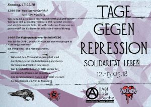 Die Tage gegen Repression vom 11. bis 13. Mai sind nun schon wieder über einen Monat her und wir möchten uns an dieser Stelle noch einmal bei allen Referent*innen und Besucher*innen für den interessanten Input, die spannenden Diskussionen und die angenehme, solidarische Atmosphäre bedanken, die das Wochenende geprägt haben und trotz des unschönen Themas Mut gemacht und Energie für weitere Kämpfe gespendet haben.