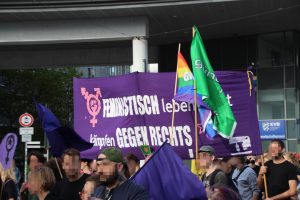 Wir durften Teil eines solidarischen und ausdrucksstarken feministischen Blocks sein um unsere Inhalte auf die Straße zu transportieren. Da Frauen* und Queers von den aktuellen gesellschaftlichen Entwicklungen besonders schlimm betroffen sind gilt es gerade jetzt, der patriarchalen Gesamtscheiße einen radikalen queeren Feminismus entgegenzusetzen!