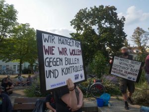 Wie an vielen anderen Abenden auch, kommen Leute dort zusammen, unterhalten sich, trinken etwas und versuchen gemeinsam dem schnöden alltäglichen Stress-Mix aus Lohnarbeit, Struggle mit dem Jobcenter, politischer Arbeit, Care-Arbeit und all dem anderen Kram ein wenig zu entkommen und abzuschalten. Wie an vielen anderen Abenden auch steht die Polizei schon im Viertel bereit. Sie umkreist den Park, beinahe jeden Abend werden Schwarze und People of Colour, linksradikale, Alkoholiker*innen und marginalisierte Menschen kontrolliert, dumme Mackersprüche vonseiten der Polizei geklopft und wenn es irgendeinen vermeintlichen Anlass gibt auch mit Ordnungsgeldern oder Anzeigen belangt.