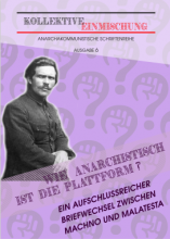 Die neue Kollektive Einmischung beschäftigt sich anhand eines Briefwechsels zwischen Malatesta und Machno mit der zwar vielleicht etwas spät gestellten, aber gewiss niemals zu spät kommenden Frage: Wie anarchistisch ist die Plattform? Dieses Mal herausgegeben von der Formlosen Organisationsplattform für das allgemeine anarchistische Unbehagen angesichts autoritärer Organisationsmodelle.