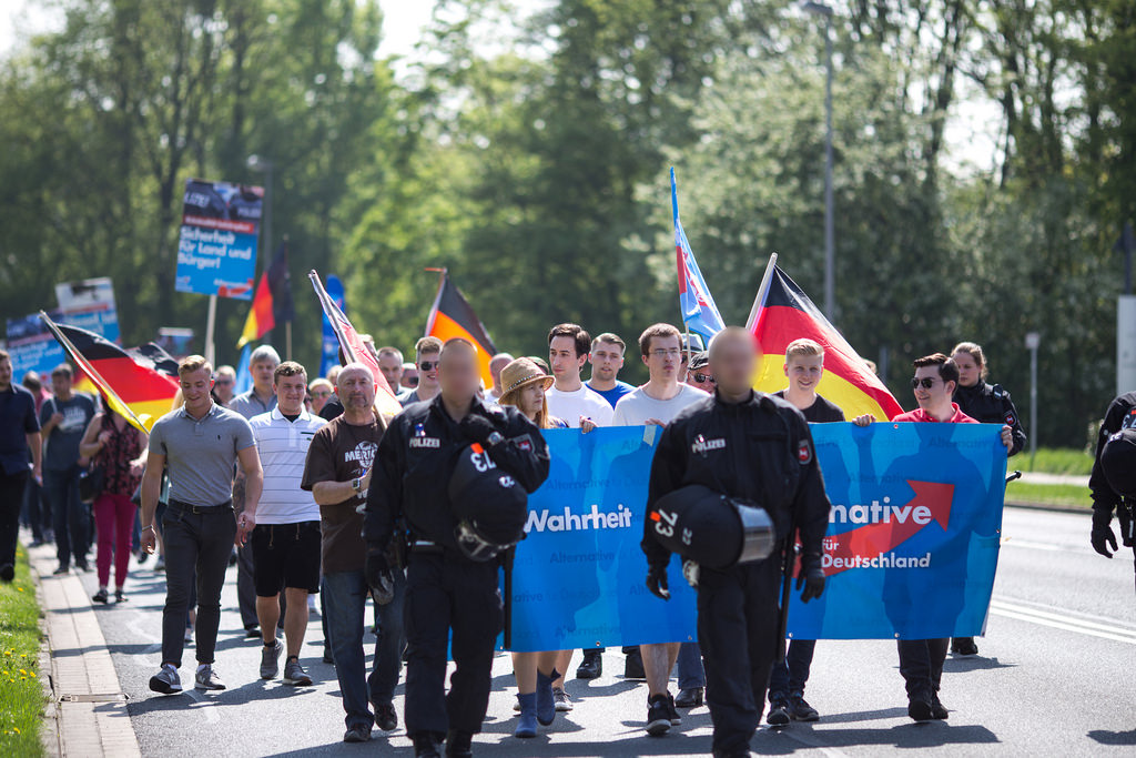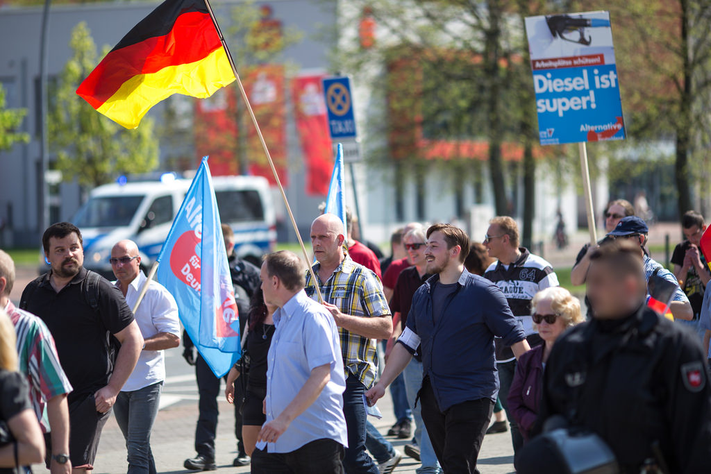 Lasse Richei (graues Poloshirt), Robert Krüger-Zechlin (5.v.r.) und Philippe Navarre (1.v.r.) auf einer Demonstration der AfD unter dem Motto „Merkel muss weg“ am 21.04.18 in Salzgitter