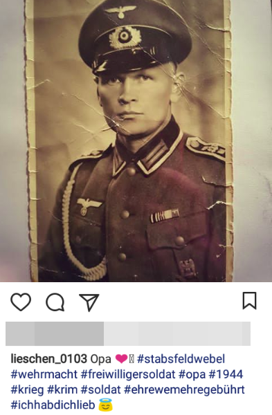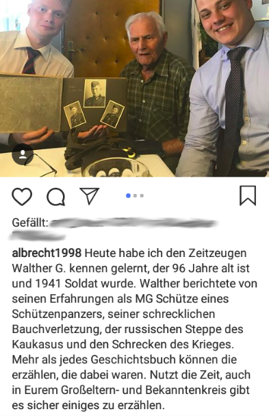 Aus seiner extrem rechten Gesinnung macht Albrecht Diederichs jedenfalls kein Geheimnis. Am 10. Juni 2018 postete er ein Bild, auf dem er gemeinsam mit Felix Leonhard Hauser und einem ehemaligen Wehrmachtsoldaten namens „Walther Grottendieck“ stolz in die Kamera grinst. Der „Zeitzeuge“ habe den Nachwuchs-Nazis von den „Schrecken des Krieges“ und seiner Tätigkeit als MG-Schütze berichtet. Bereichert wird der NS-Kitsch durch weitere Aufnahmen des alten Wehrmachtsoldaten, die ihn unter anderem mit weiteren Nazis auf einem Panzer zeigen.