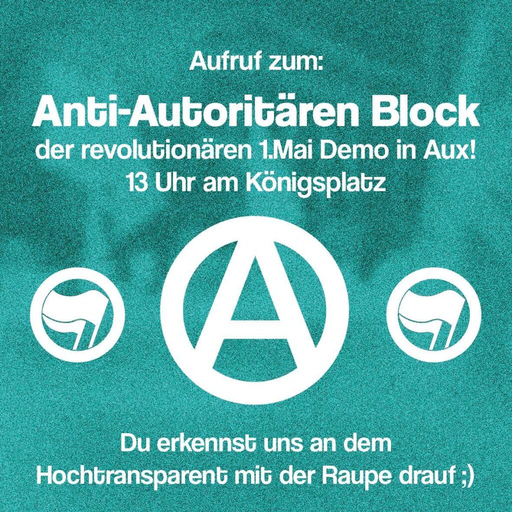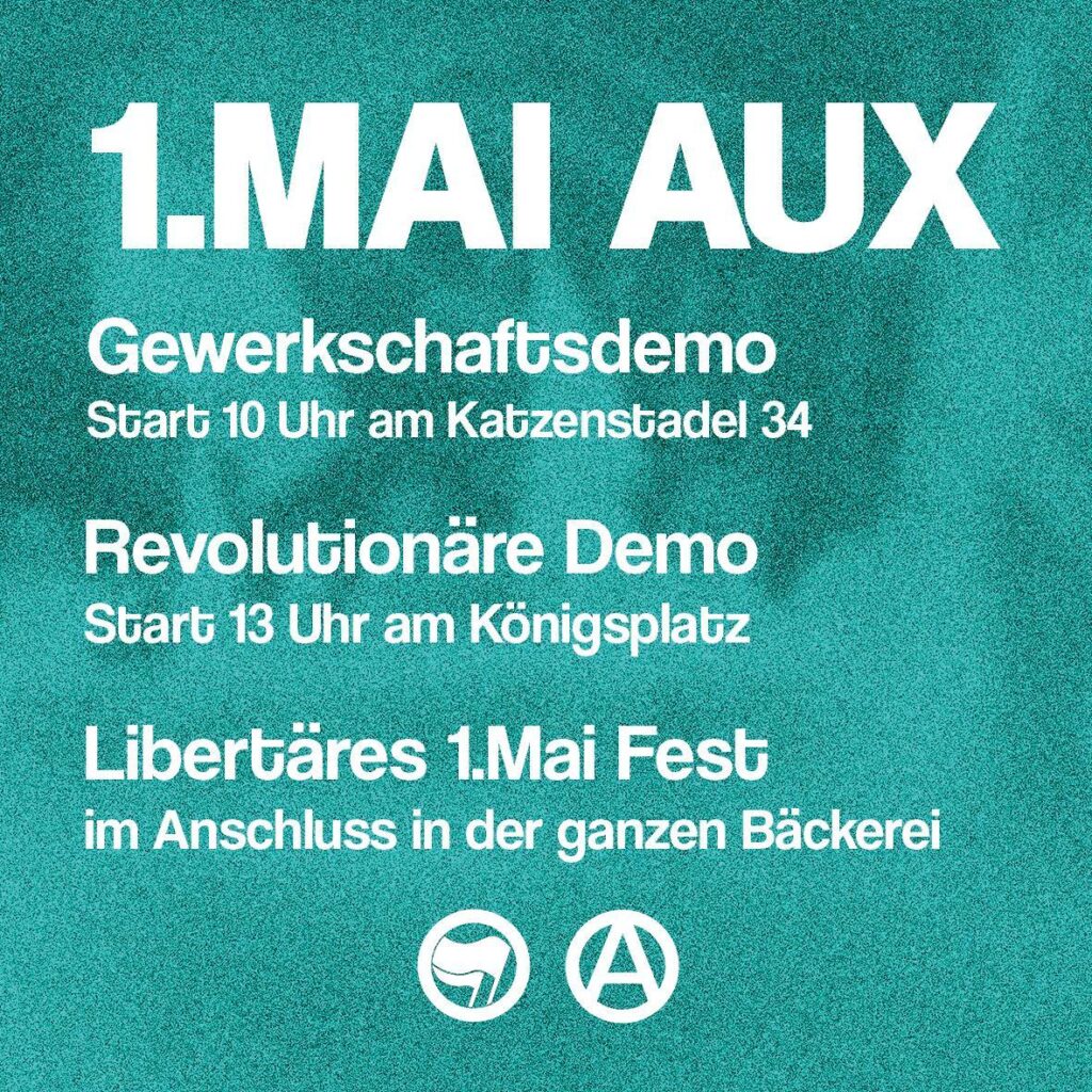 Im Anschluss wird dann die revolutionäre Demo durch Augsburg ziehen. Los geht es um 13 Uhr am Königsplatz. Wir werden dieses Jahr zusammen mit anderen Organisationen einen eigenen antiautoritären Block bilden.