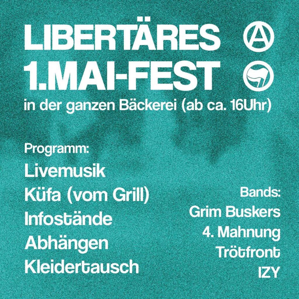Abschließend wird es dann ab circa 16 Uhr erstmalig ein libertäres 1. Mai Fest mit tollem Programm in der ganzen Bäckerei geben. Unter anderen wirds Live-Musik, Infotische und Küfa geben!