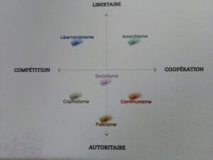Volvamos a la política que todo el mundo conoce. Derecha ⟷ Izquierda. ¿De acuerdo? Tengo la impresión de que no es realmente muy claro para todo el mundo… pero que todo el mundo finge que sí lo es. Bueno, consideremos por simplificación (tendremos tiempo para discutirlo) que se trata en primer lugar del eje siguiente: Competencia-desigualdad-y-ley-del-más-fuerte ⟷ Cooperación-igualdad-y-comunidad. Derecha ⟷ Izquierda. ¿Me hago entender?