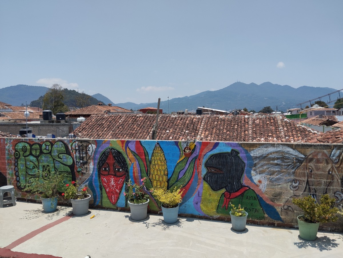»[…] San Cristóbal ist deutlich touristischer, als ich es mir vorgestellt habe. Das erweckt hier oft den Eindruck von ganz verschiedenen Realitäten, die hier nebeneinander existieren. Durch die Verbindung mit den Compas [hier gemeint: die zapatistischen Pueblos] und den widerständigen Strukturen vor Ort, weiß man natürlich Bescheid über die politisch sehr angespannte Lage in ganz Chiapas: die Angriffe auf widerständige Comunidades [Gemeinden] durch repressive Staatsorgane, Paramilitär und Narcos [Mitglieder der Drogenkartelle], die Spaltungsversuche der Pueblos durch die Regierung, die Repression und Gewalt gegenüber migrantischen Menschen, deren Fluchtroute in Richtung USA durch Chiapas führt. […] Aktuell ist die Lage nochmal besonders angespannt, da am 2.6. hier Wahlen stattfinden werden [Präsidentschaftswahlen wie auch auf Bundesstaaten- und lokaler Ebene].