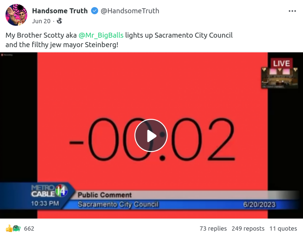 A relatively recent member of NorCal Active Club as of 2023, Petero has become a regular face at nazi showings in the Central Valley, and attempted to make a name and career for himself as a nazi merch salesman under the alias “Scottie BigBalls”. He is heavily involved with the Goyim Defense League, has led harassment campaigns of both Walnut Creek City Council and Sacramento City Council, and has distributed antisemitic fliers repeatedly in Modesto and the Central Valley.