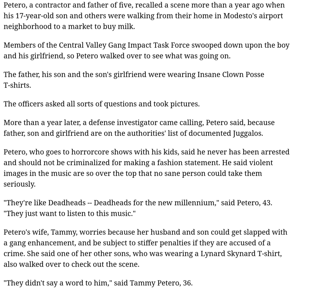 Haley Phillips and Harley Petero’s introduction to openly antisemitic politics was likely through the Q-Anon subsection of the MAGA movement. Coming from a family of Juggalos (fans of the horrorcore band Insane Clown Posse), the Petero family along with Haley Phillips was featured in a 2009 Modesto Bee article describing a run in with the Central Valley Gang Impact Task Force over supposed “Juggalo” gang affiliation.