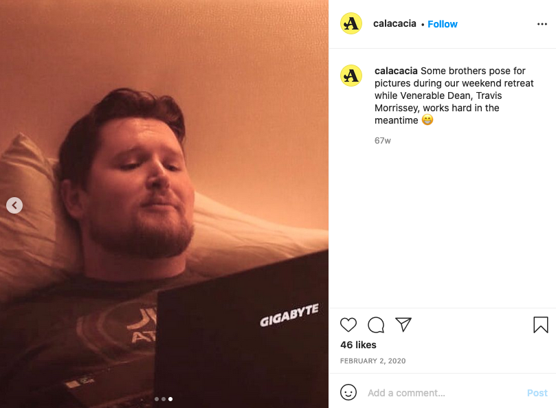 The official “@calacacia” Instagram account confirming Travis Morrissey’s past leadership position as “Venerable Dean” of Berkeley Acacia. Morrissey likewise claims to have served as treasurer in addition to his role as founder and president of the fraternity.